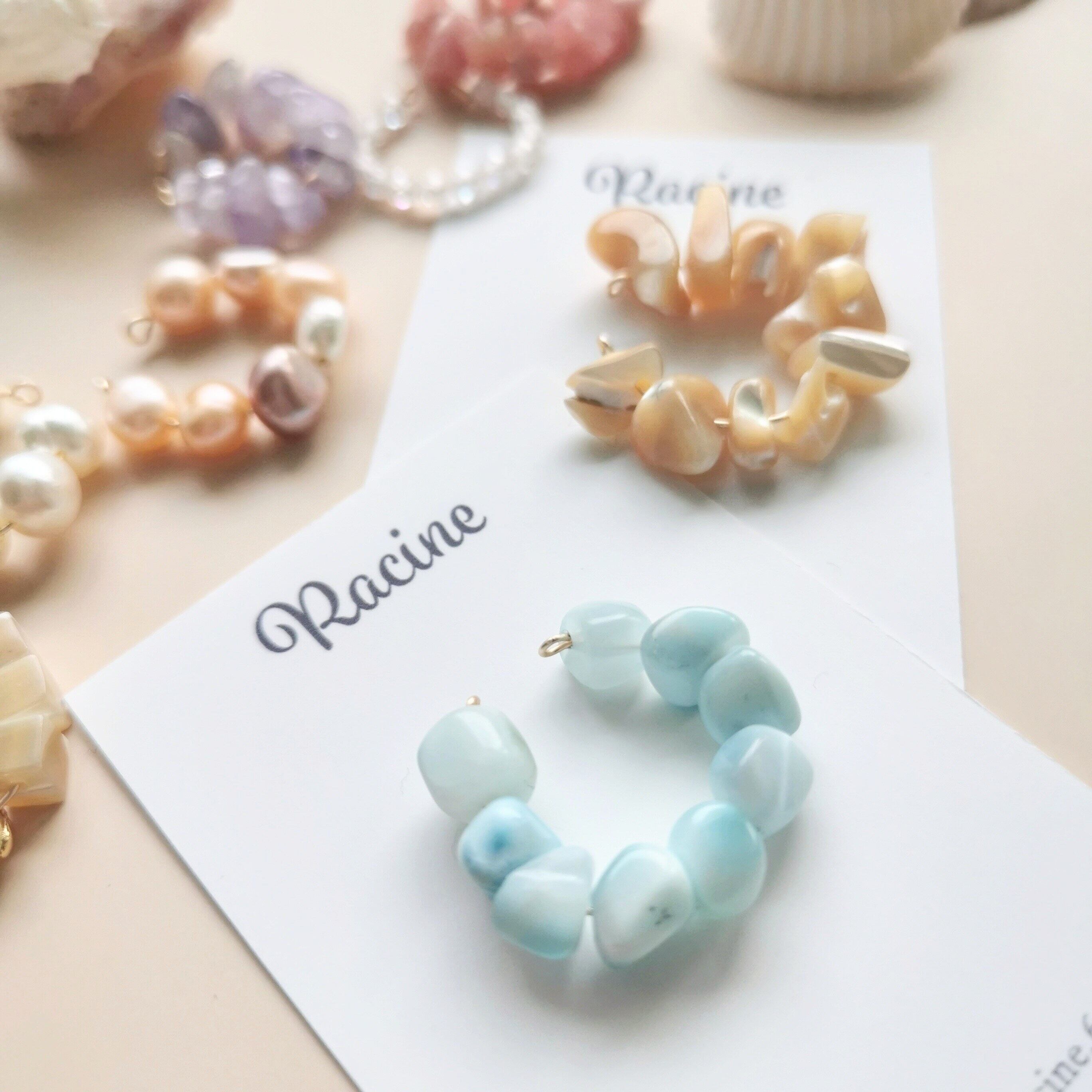 天然石、シェルを使用した他の人とはかぶらない一点物のイヤーカフを作りました!